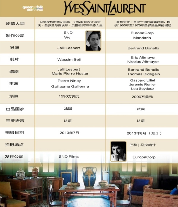 法国人对圣罗兰是爱不释手(圣罗兰获得过法国国家荣誉勋章,最终以国葬礼仪下葬),早在2010年就有一部高口碑的YSL纪录片《疯狂的爱》问世,该片获得瞭多伦多电影节的国际影评人费比西奖(QAF中文站近期将推出)。但今年一次性出现两部YSL传还是让人有点无语:一部是由加里·勒斯培导演,法国新生代美男皮埃尔·尼内主演的;一部是由贝特朗·波尼洛导演,法国著名男星加斯帕德·尤利尔主演的。两部都叫"YSL传”。按照作者电影的惯例,我们暂时分别称它们为"J-YSL传"和"B-YSL传"。