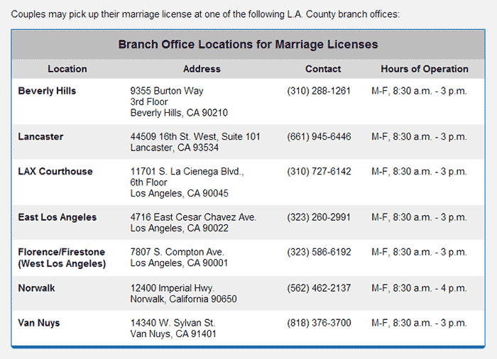 在线申请结婚许可证之后的15天内,伴侣就可以一同前往可以去洛杉矶县书记处的任意一处办公处(一共7个办公处)领取结婚许可证。办公处工作时间为周一至周五,上午8:30至下午3:00,不要忘记两个人都要携带有效的身份证明,例如护照。