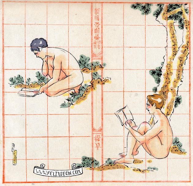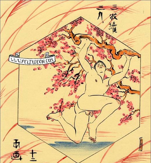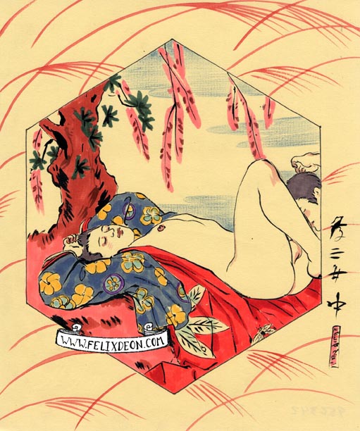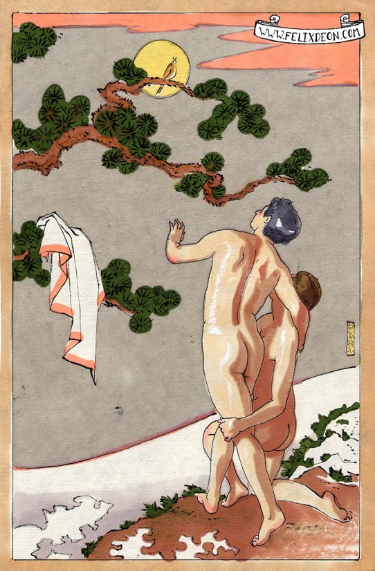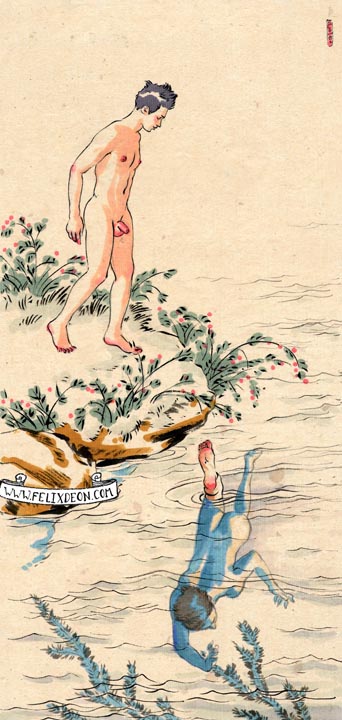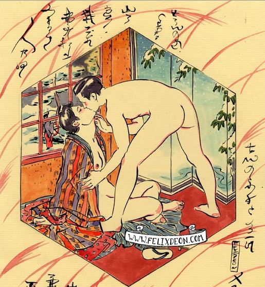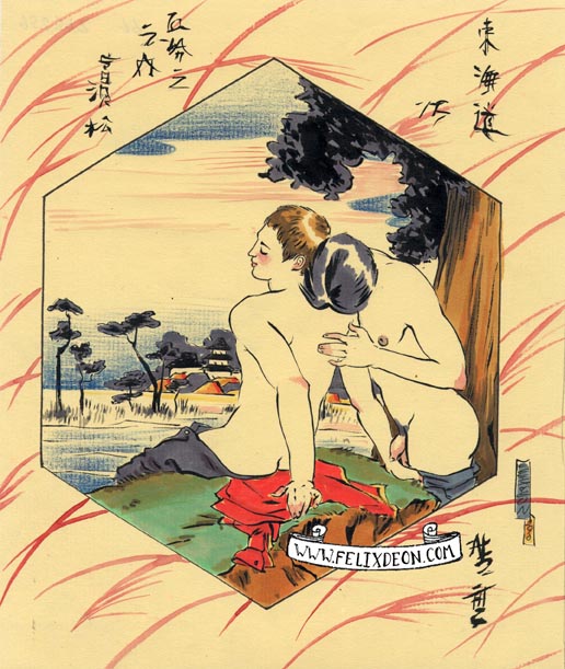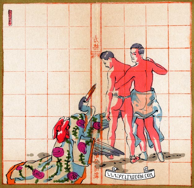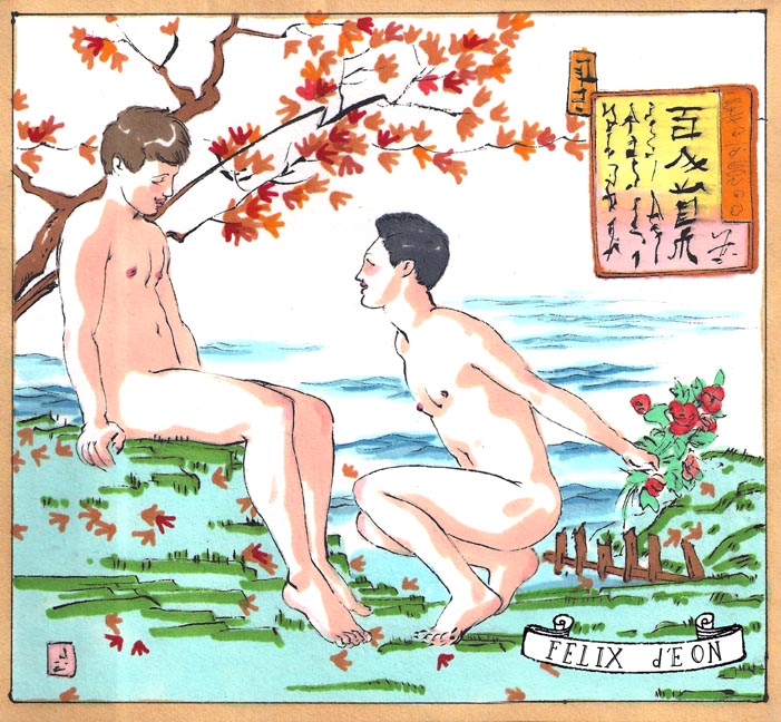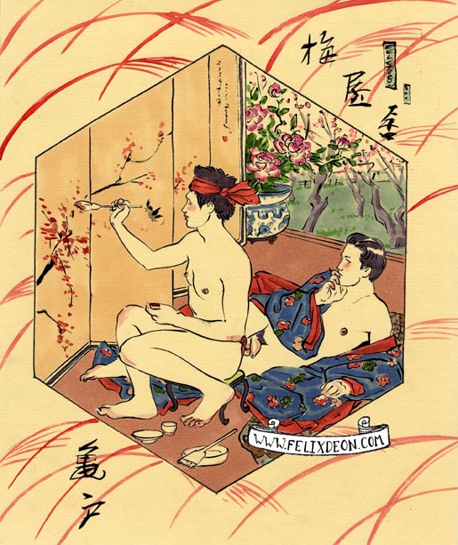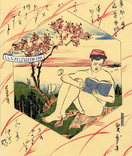 菲利克斯的绘画风格多变而充满异域风味。他尤其擅长模仿日本浮世绘中的色彩与线条,给人耳目一新的特殊感官享受。以下,就请欣赏菲利克斯·德宙的浮世绘风格、同志题材的绘画作品。